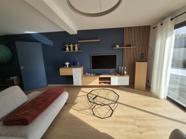 – 1 claustra côté droite composé d’un panneau arrière laqué couleur coordonnée à l’existant et de 17 carrelets chêne