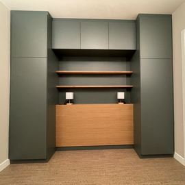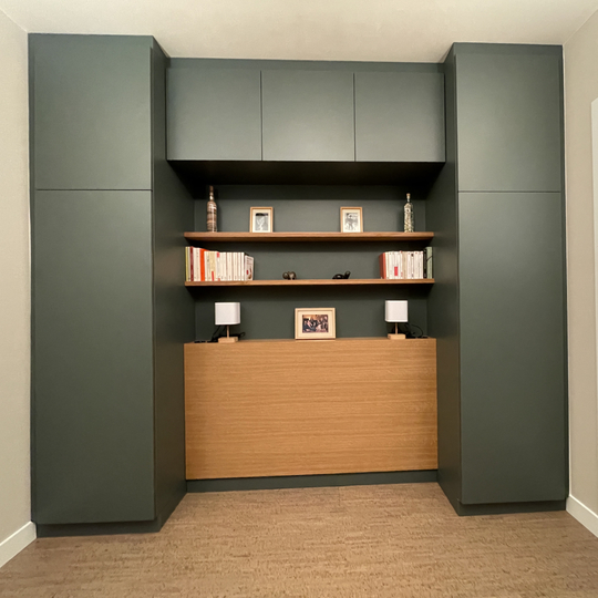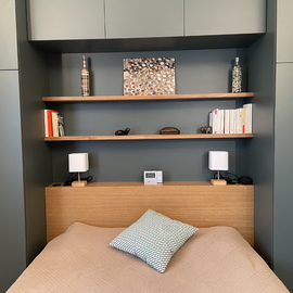 – ensemble tête de lit ajusté au long des murs et sous plafond via fileurs et bandeau.